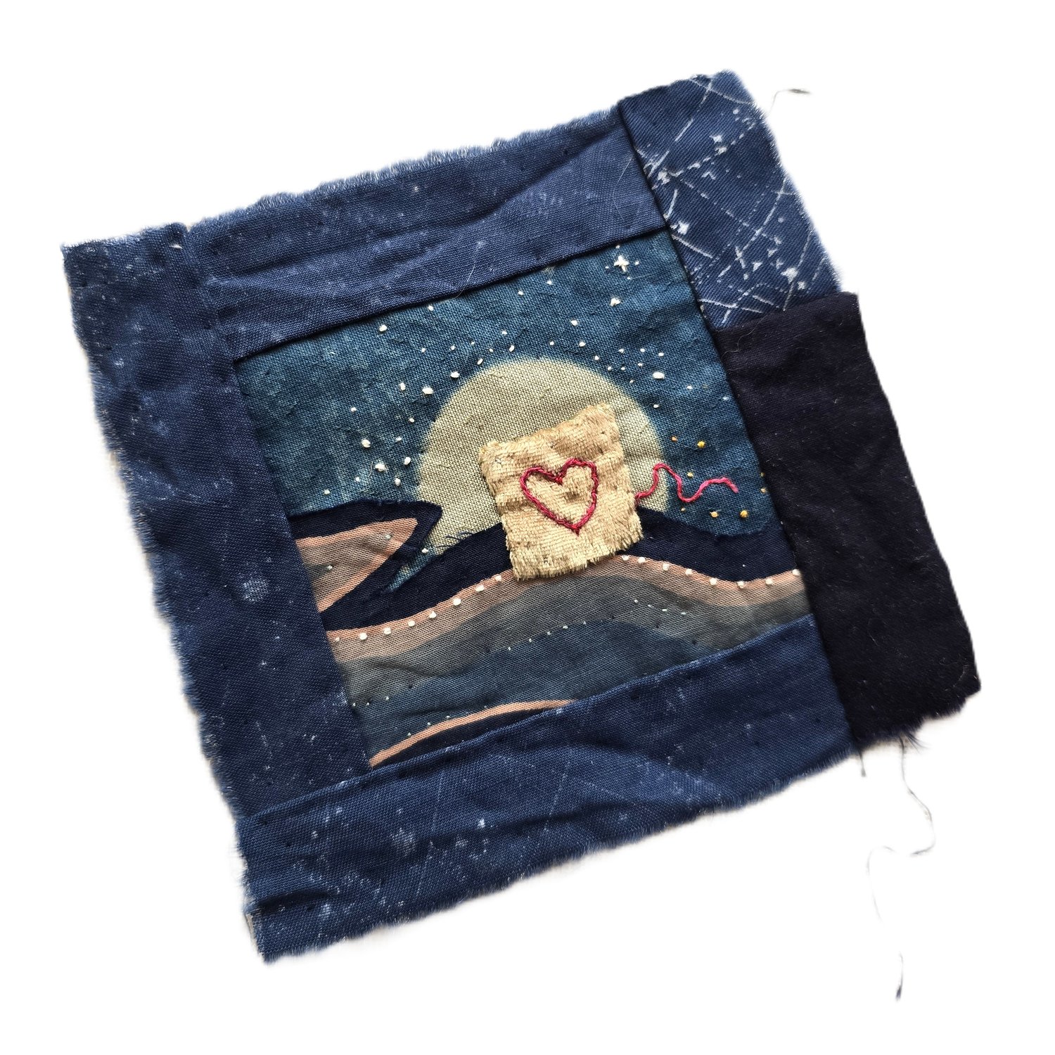 A stray self. A hand stitched story block. Cobbled foundation style with indigo dyed scraps of self. Cotton and silk. 6" square-ish. USA only Shipping included.