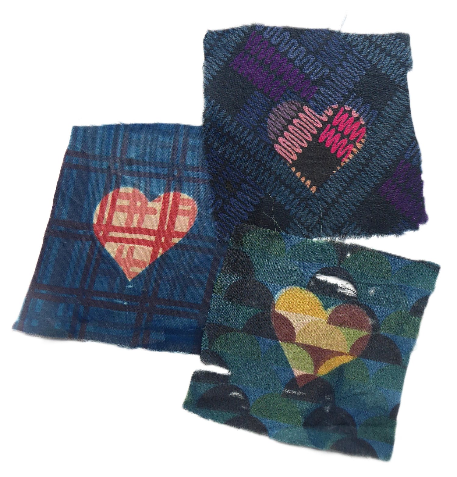 In a pile of old fabric I inherited from somewhere I found a piece of ragged patchwork made from very, very old silks. I carefully snipped it apart, rescuing the fragile components, and then indigo-shibori-dyed them . . . with hearts.