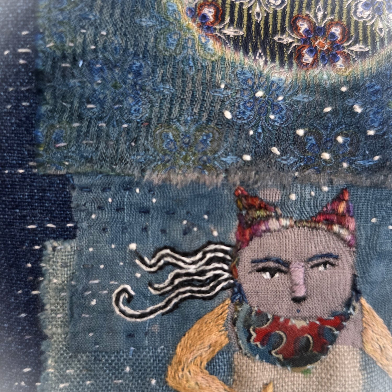 4.5" x 7". Cotton and silk, indigo dyed scrap.