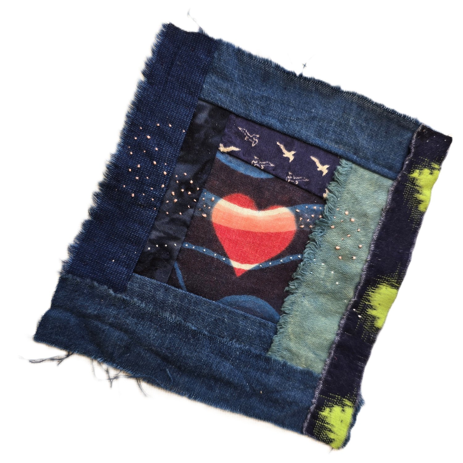 And we'll get through. A loose stitched story block. Cobbled foundation style with Indigo dyed cotton scrap. 5.5" square-ish. USA only Shipping included.