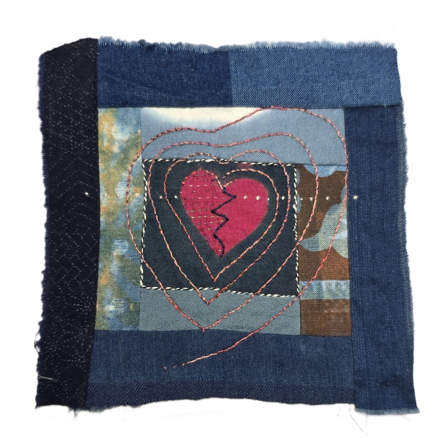 Hand cobbled, foundation style, around a loose dyed patch, hand embroidered.