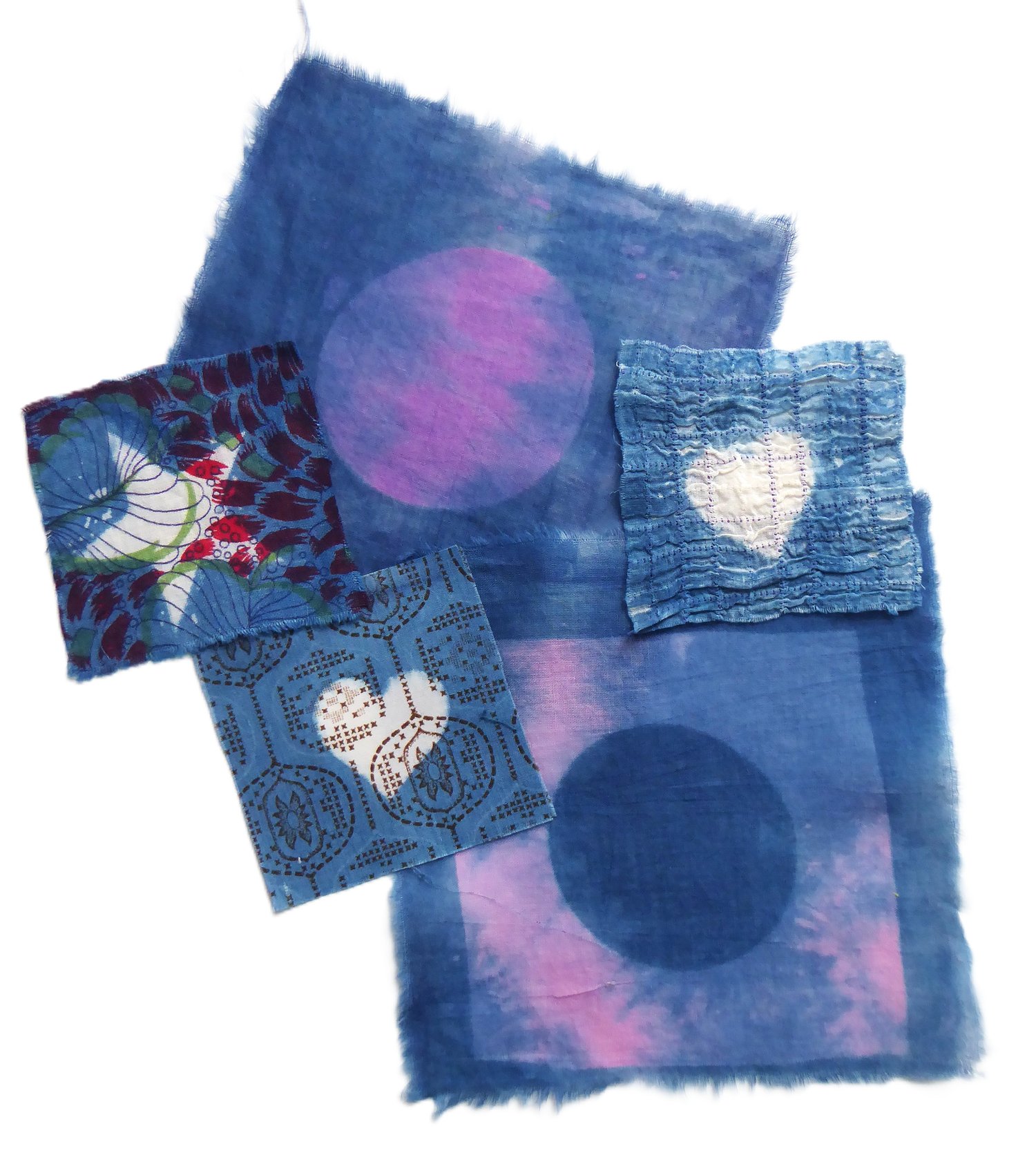 Four patches of vintage fabric. Snipped 3" & 5" square. Then indigo-eclipsed.