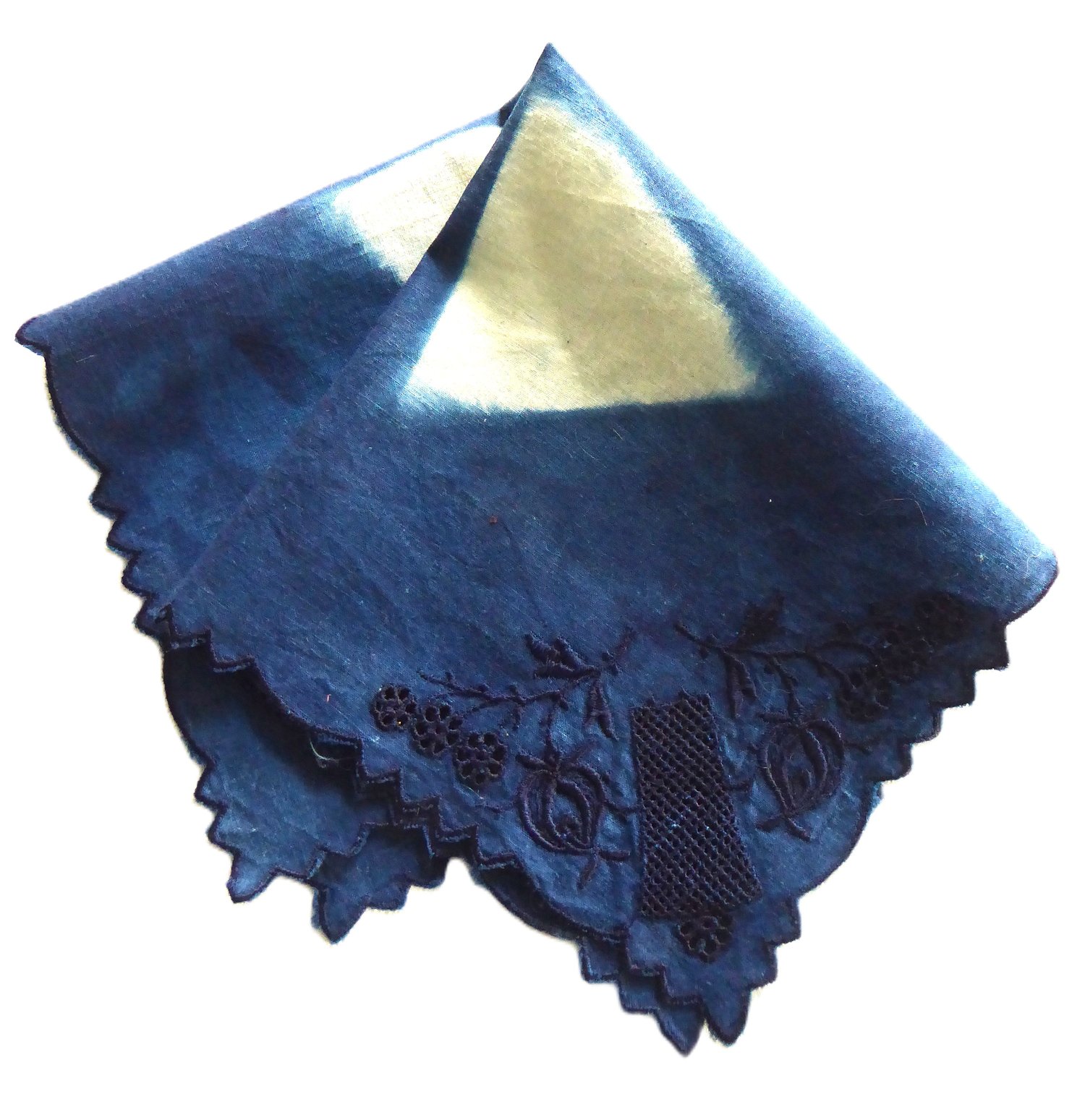 A tightly woven vintage cotton handkerchief. With a hand-stitched corner and hem. About 9.5" square. Indigo-dipped.