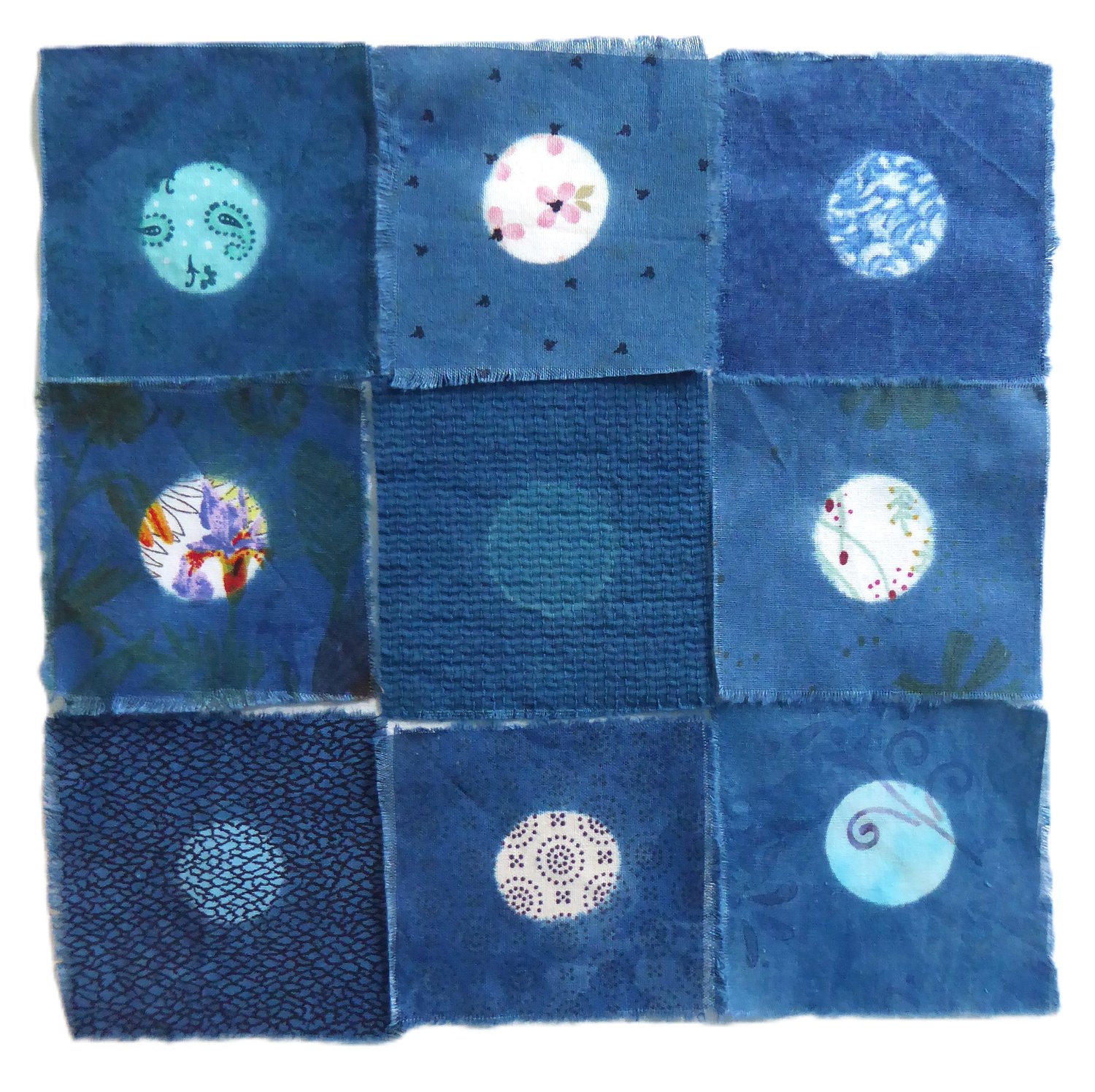 Nine patches of vintage fabric.