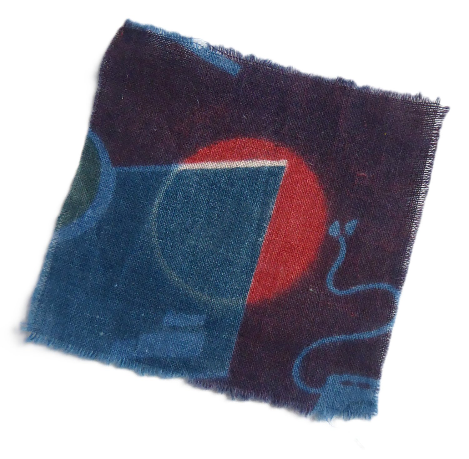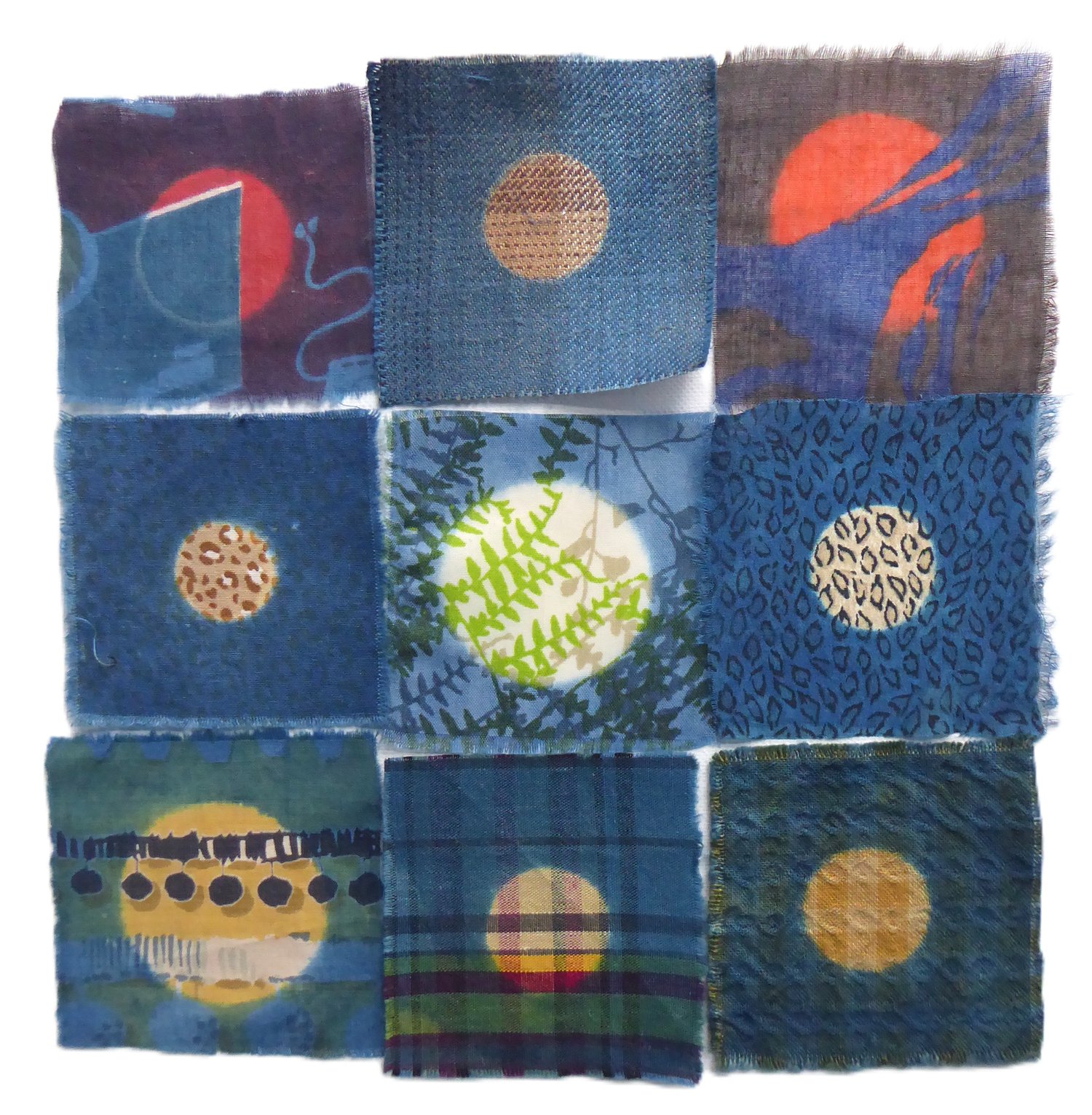 Nine patches of vintage fabric. Snipped about 3" square. Then indigo-dipped.