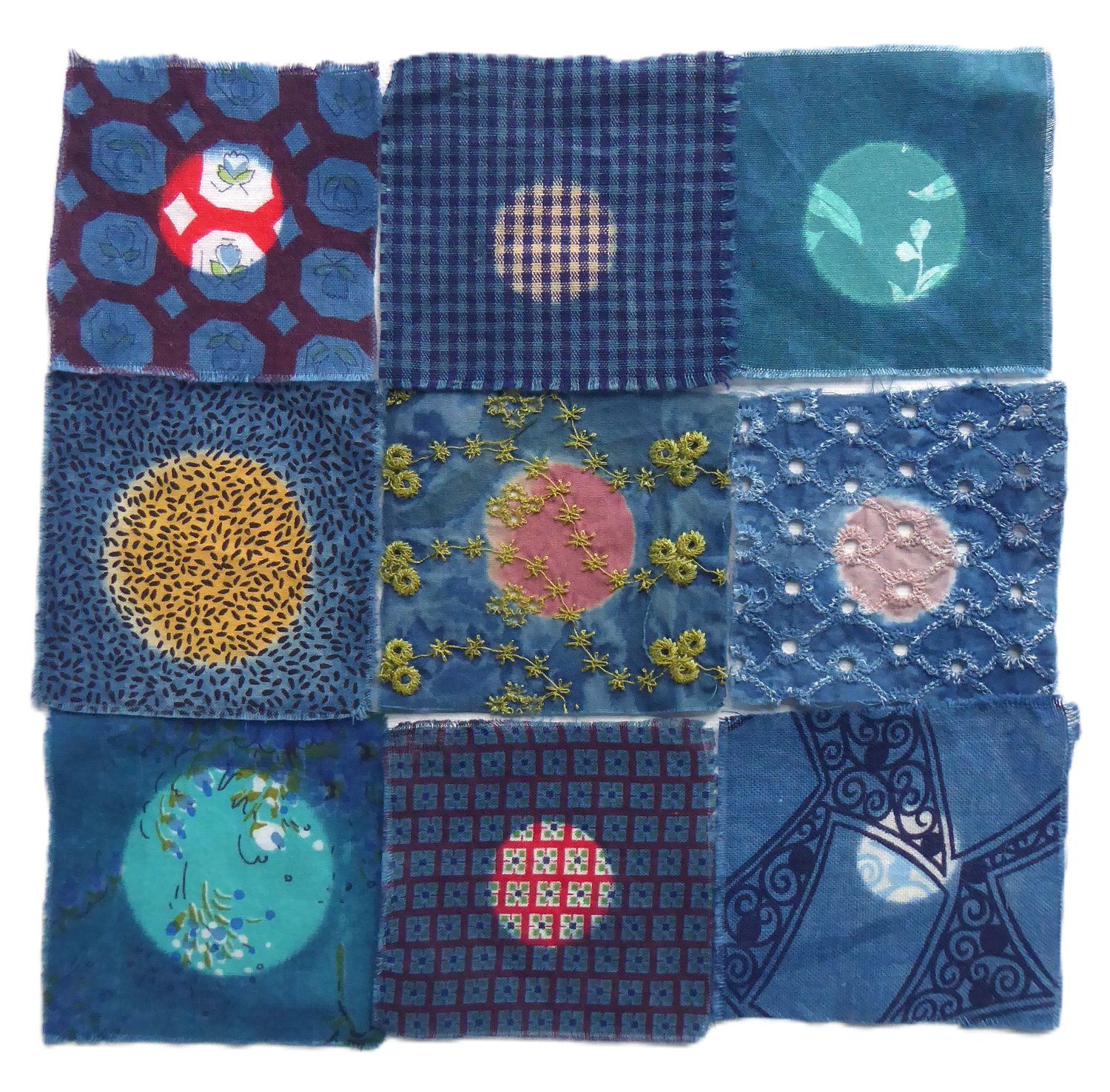 Nine patches of vintage fabric. Snipped about 3" square. Then indigo-dipped.