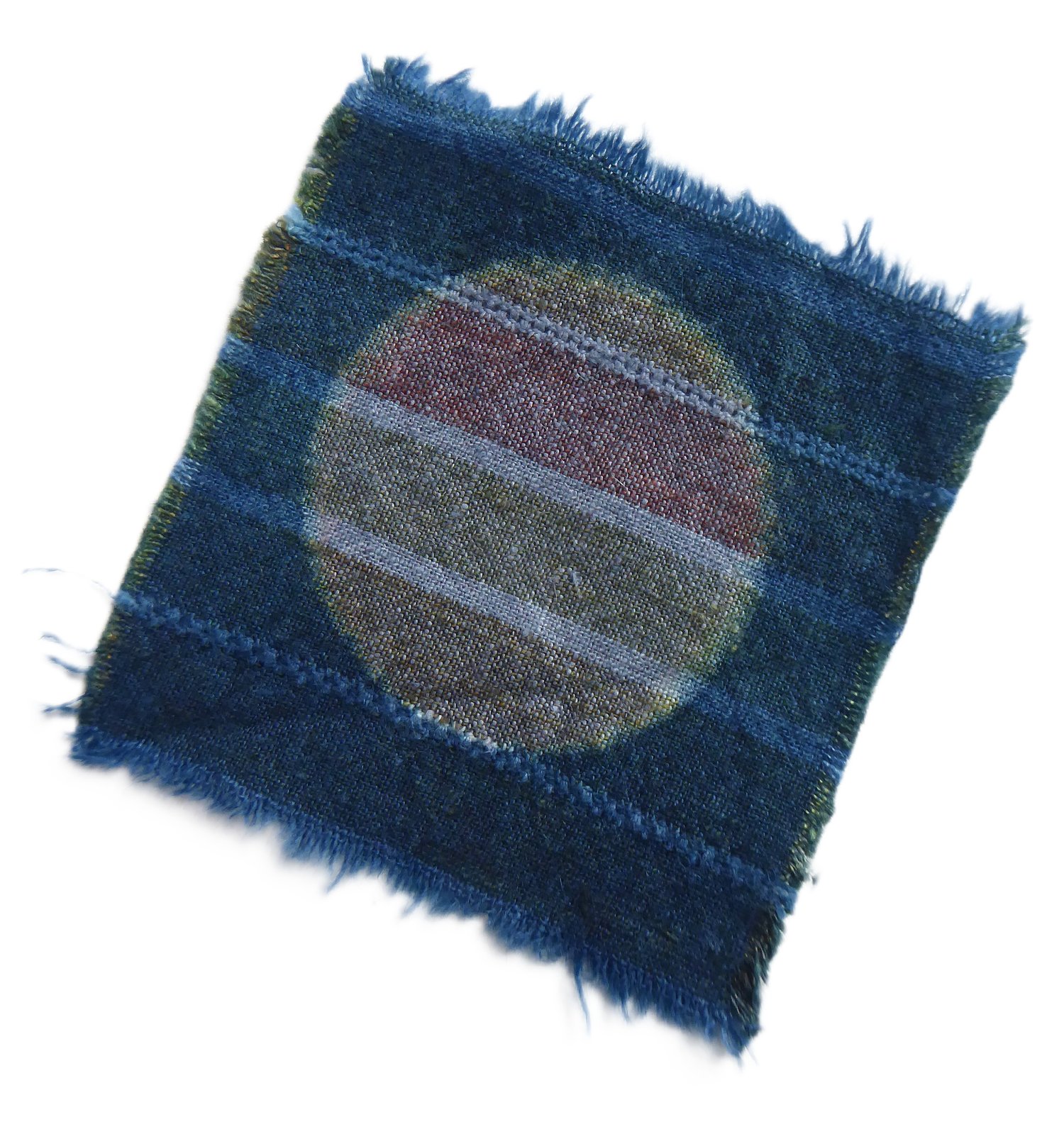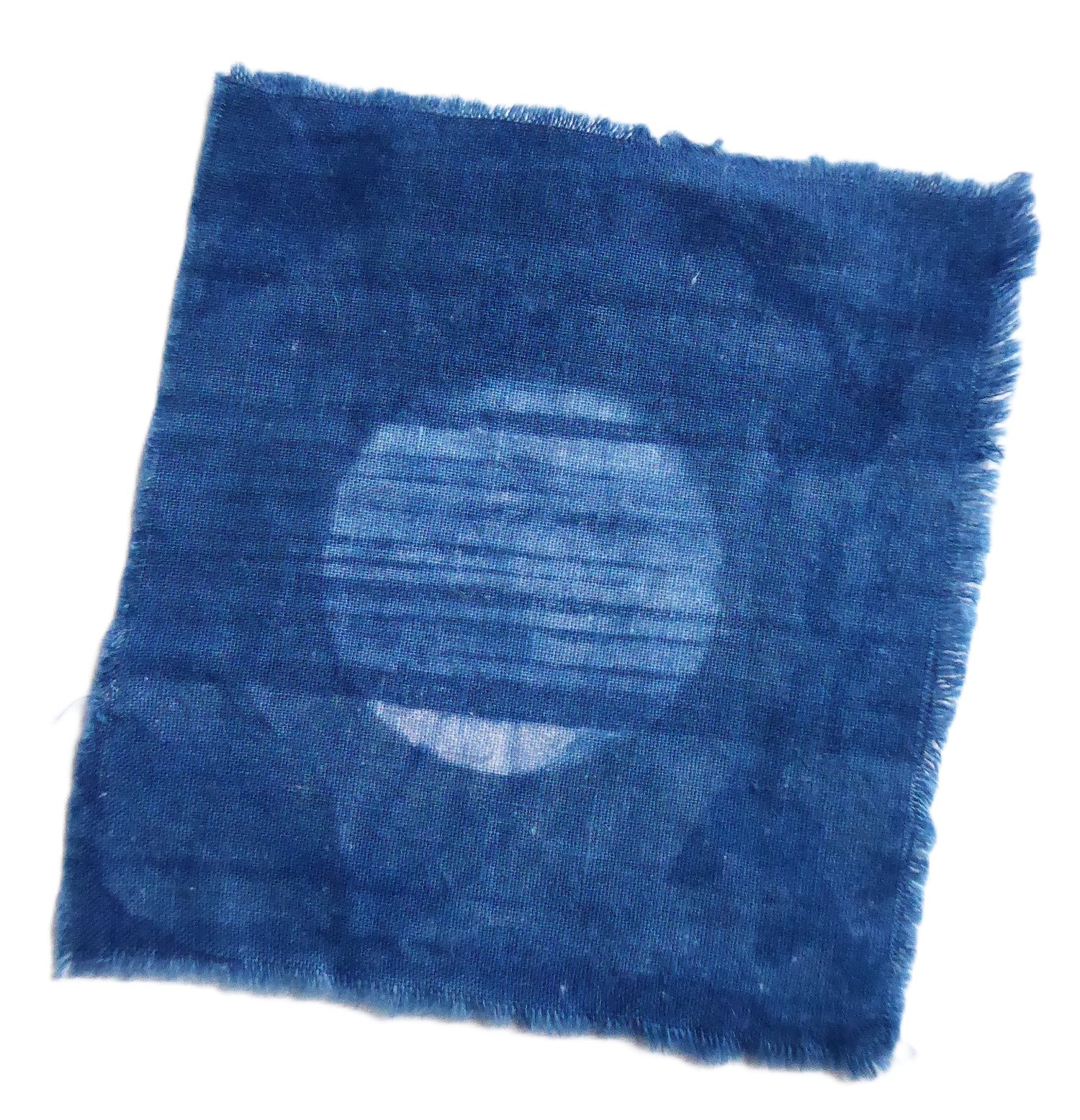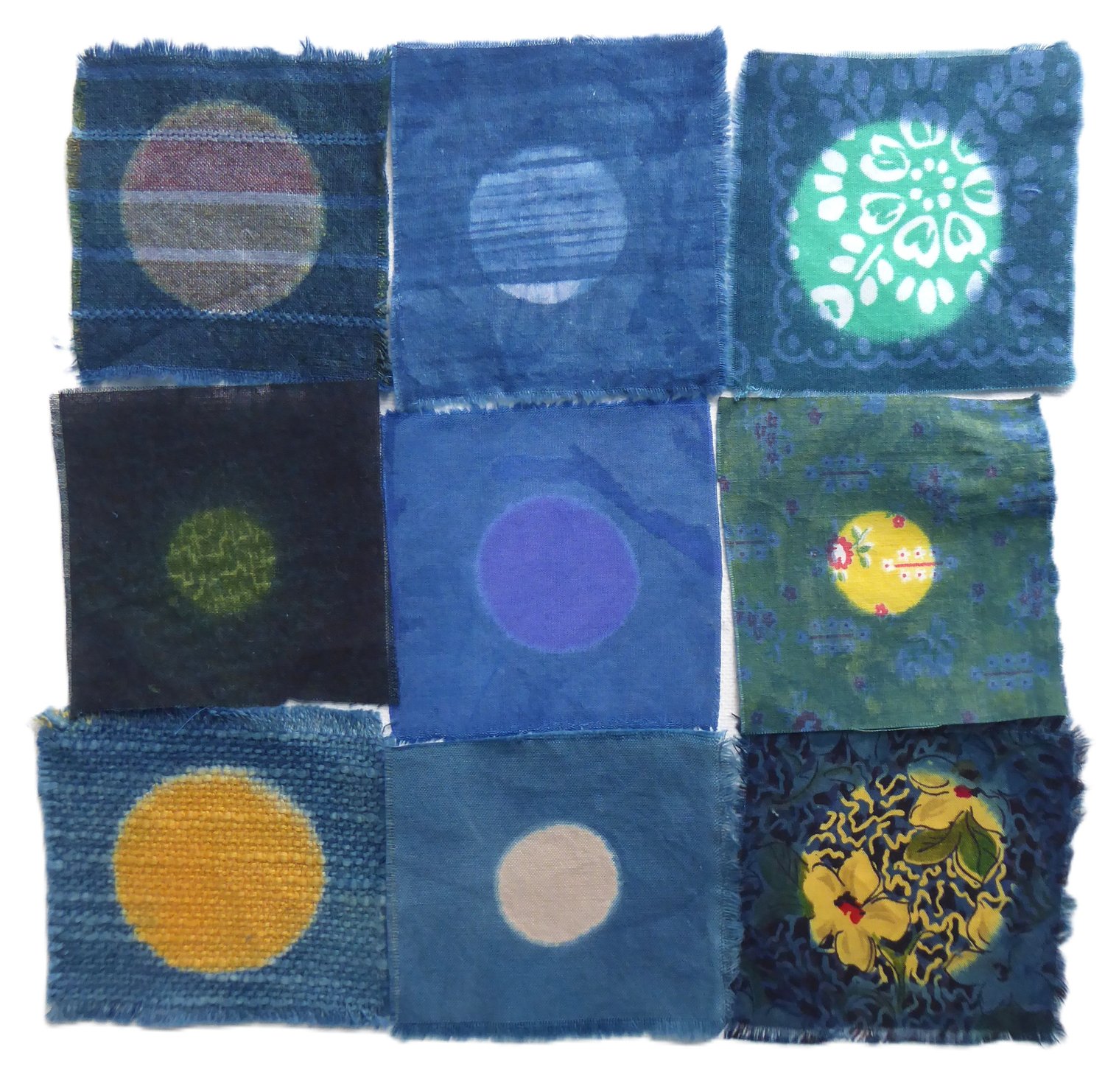 Nine patches of vintage fabric. Snipped about 3" square. Then indigo-dipped.