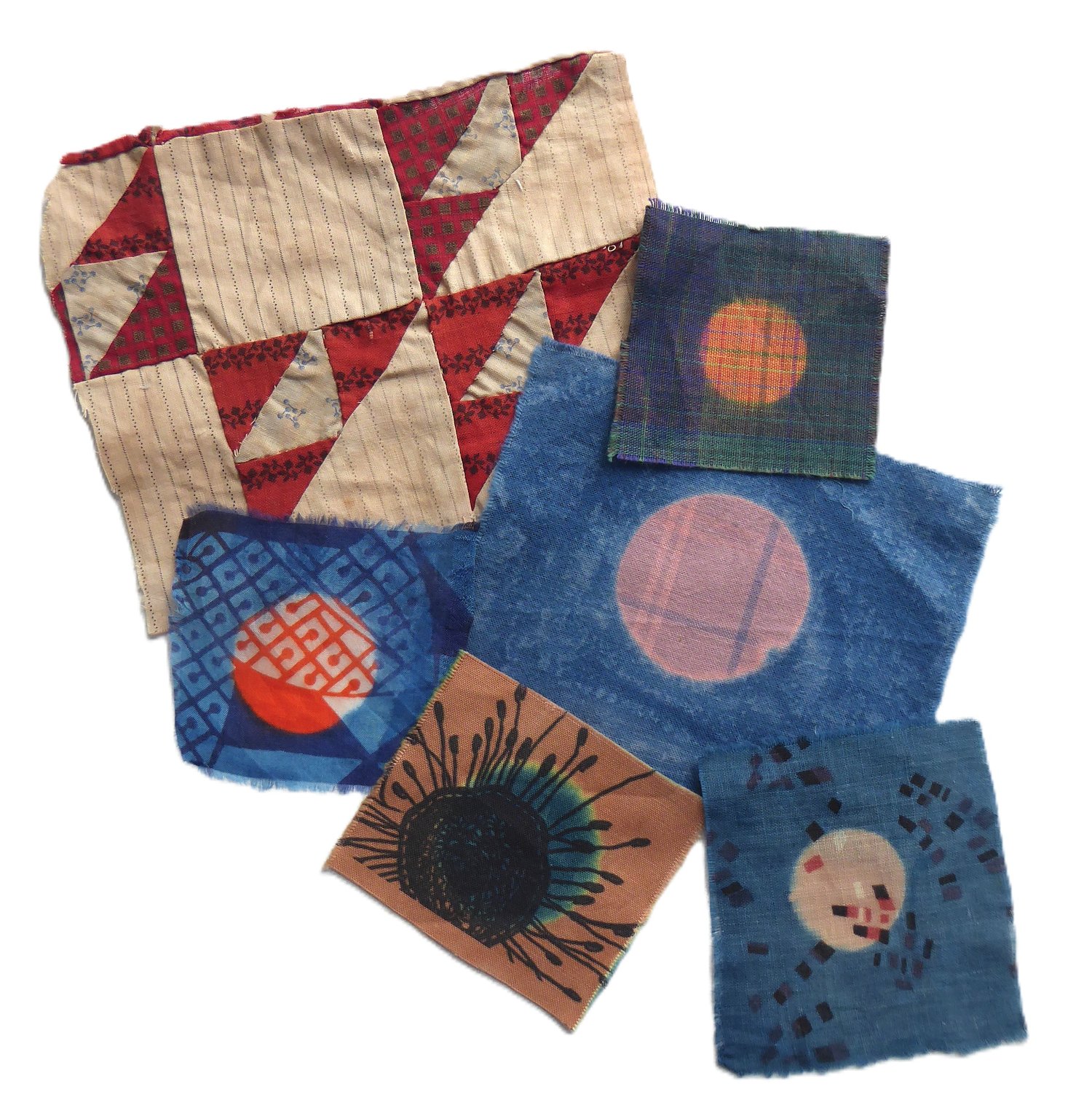 And five patches of vintage fabric, snipped various sizes, then indigo-dipped.