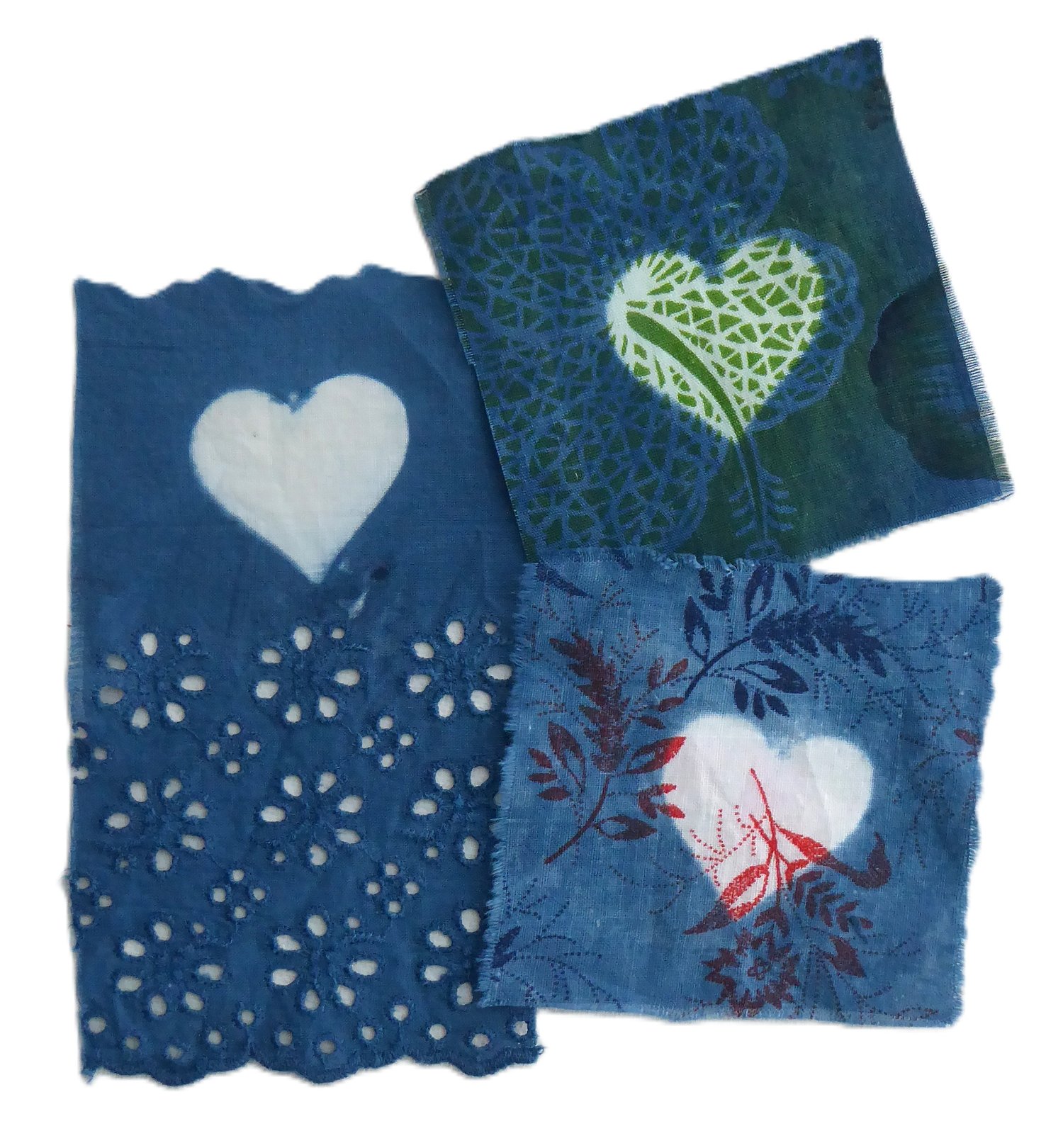 Three patches of vintage fabric. Snipped about 3" square. Then indigo-dipped.