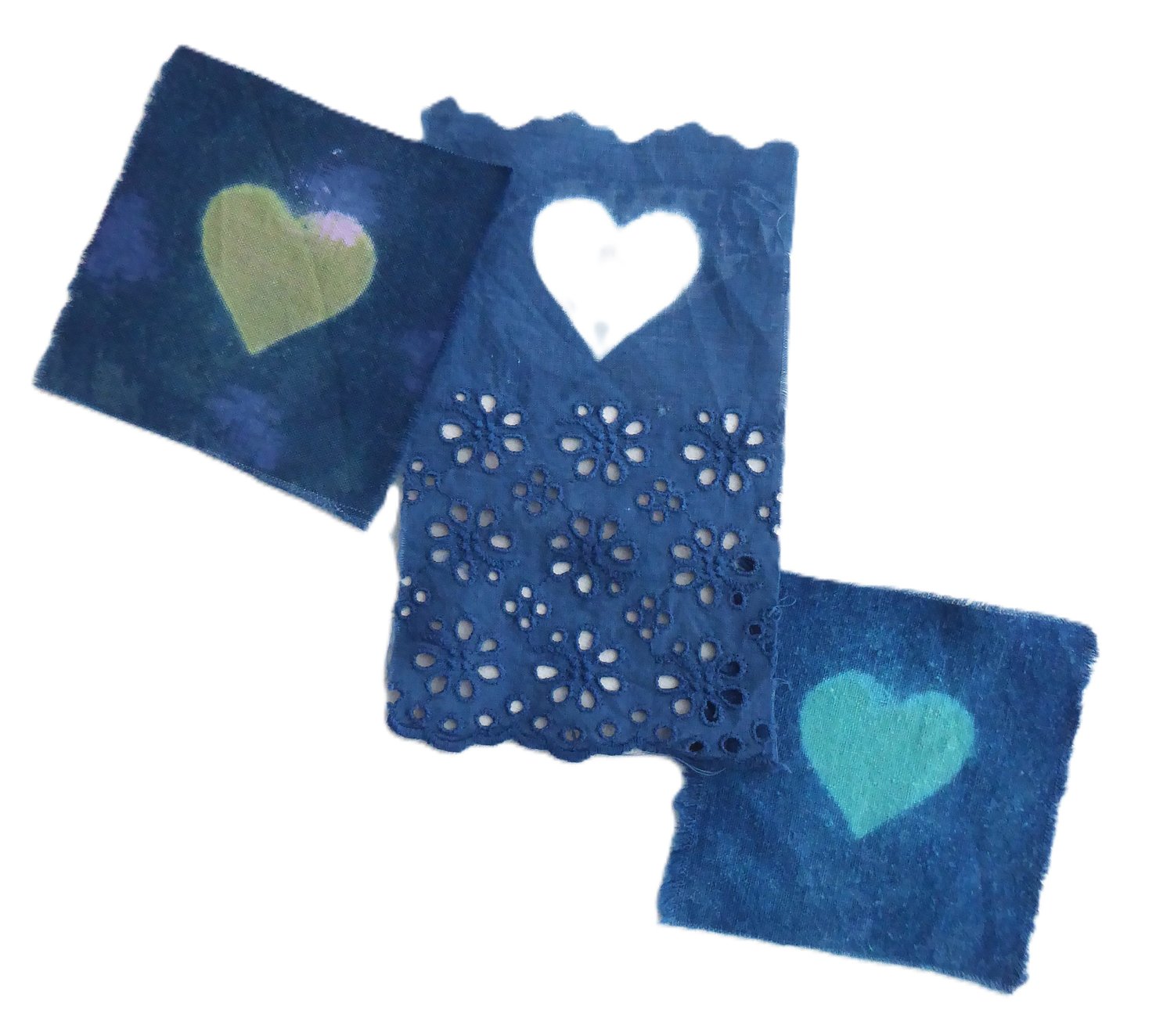 Three patches of vintage fabric. Snipped about 3" square. Then indigo-dipped.